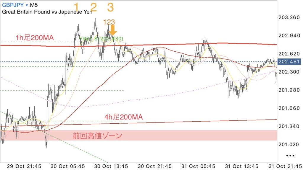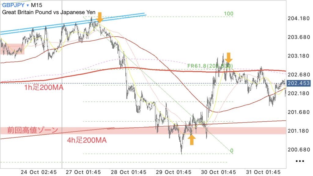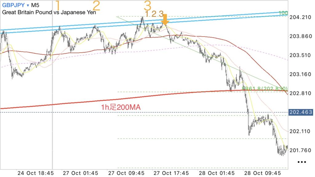 理想③ 高値TLからの大きな急下降に対して、FR61.8+1h足200MAでの三尊+ミニ三尊で売り。