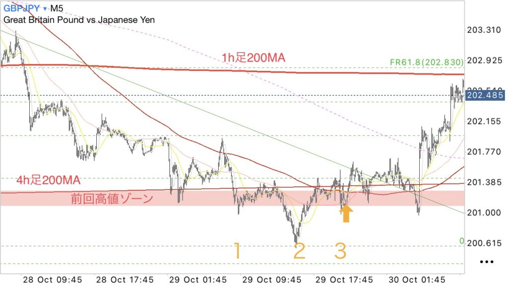 理想② 4h足200MA+前回高値ゾーンでの逆三尊で買い。