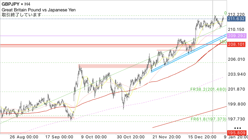 ・4h足レベルで、1h足レベルのともに上昇トレンド中なので買い目線。