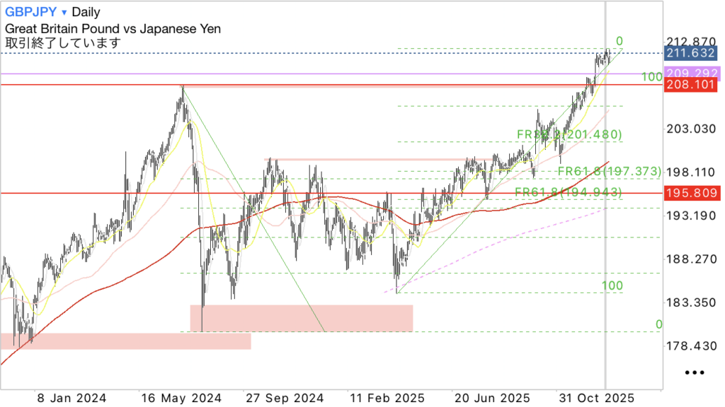 ・日足レベルでは上昇トレンドで高値更新としているので買い目線。