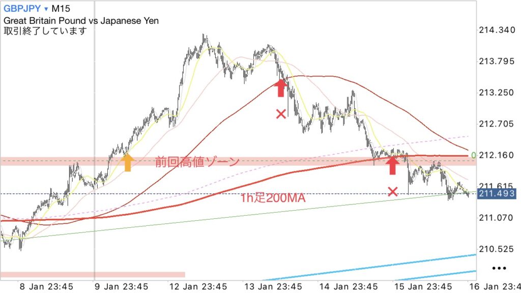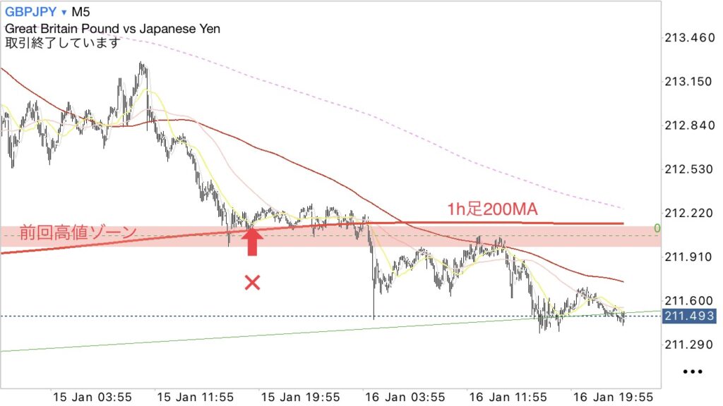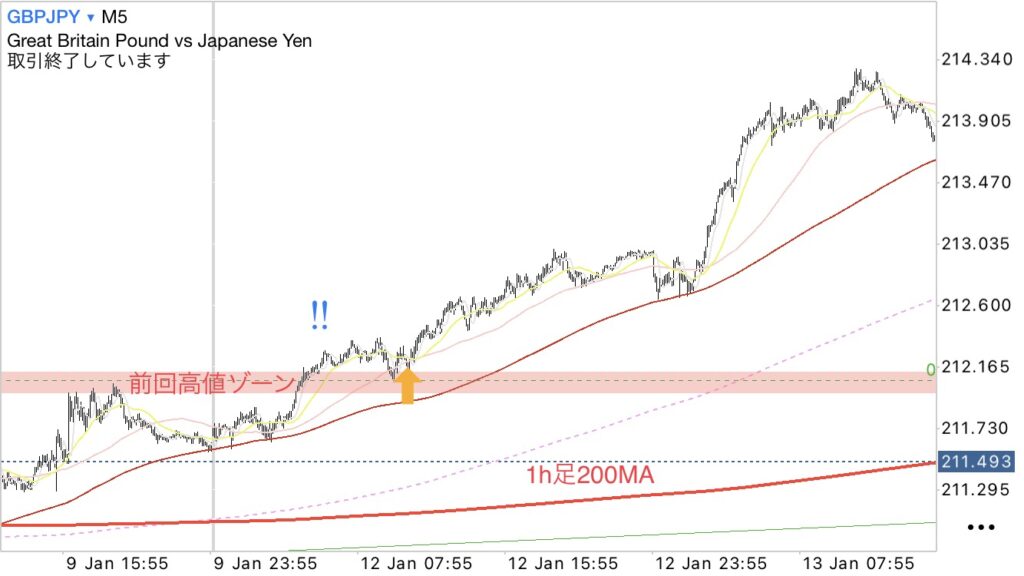 実績② 前回高値ゾーン+1h足200MA辺りで押し目買いからの損切り。