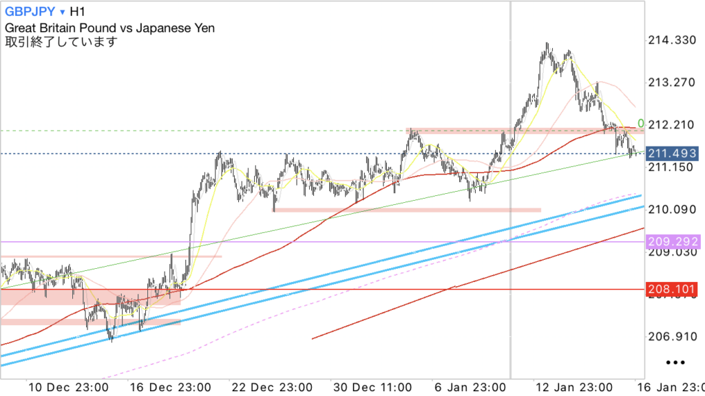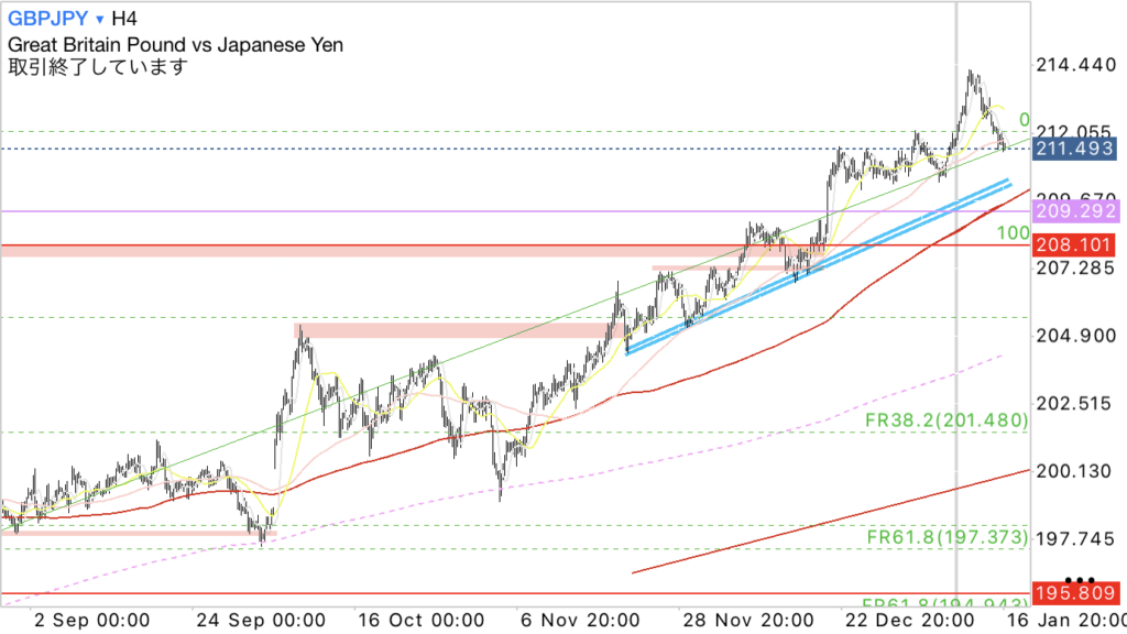 ・4h足レベルで、1h足レベルのともに上昇トレンド中なので買い目線。