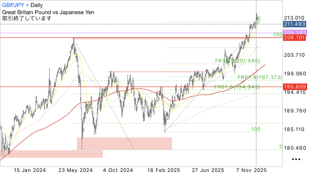 ・日足レベルでは上昇トレンドで高値更新としているので買い目線。