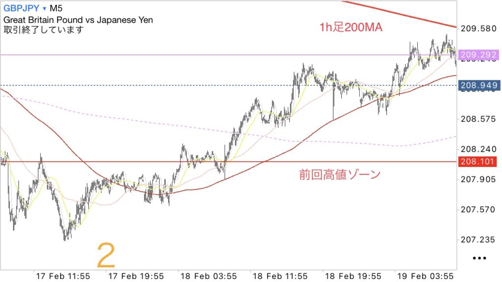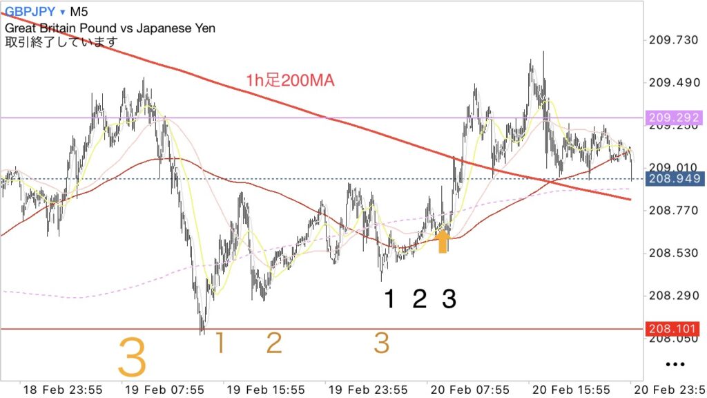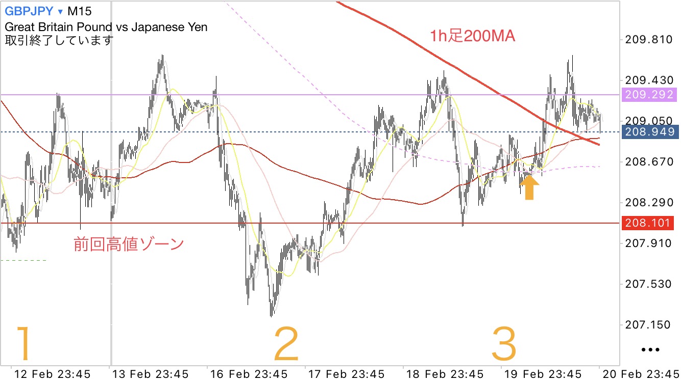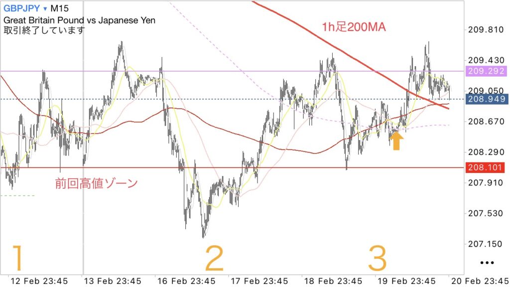 理想① 前回高値ゾーン(サポレジ)辺りでの大逆三尊+逆三尊の15分足200MA辺りでのミニ逆三尊で買い。