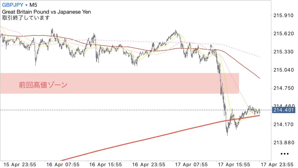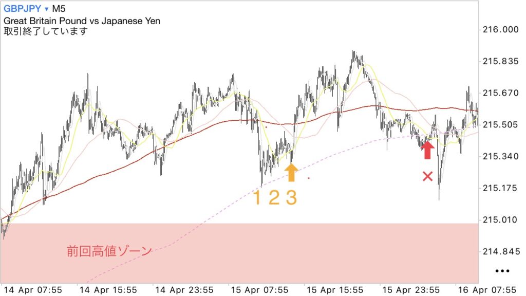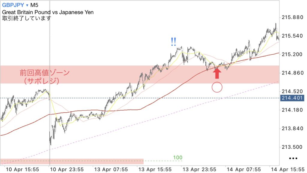 実績① 高値更新(青‼︎)からの前回高値ゾーン(サポレジ)+5分足200MA辺りでのWで買い