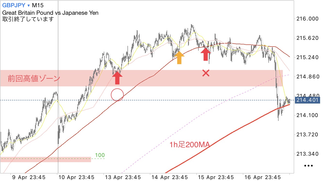 ・シナリオとしては、15分足200MA、1h足200MA、4h足200MA辺りでの買い狙い。